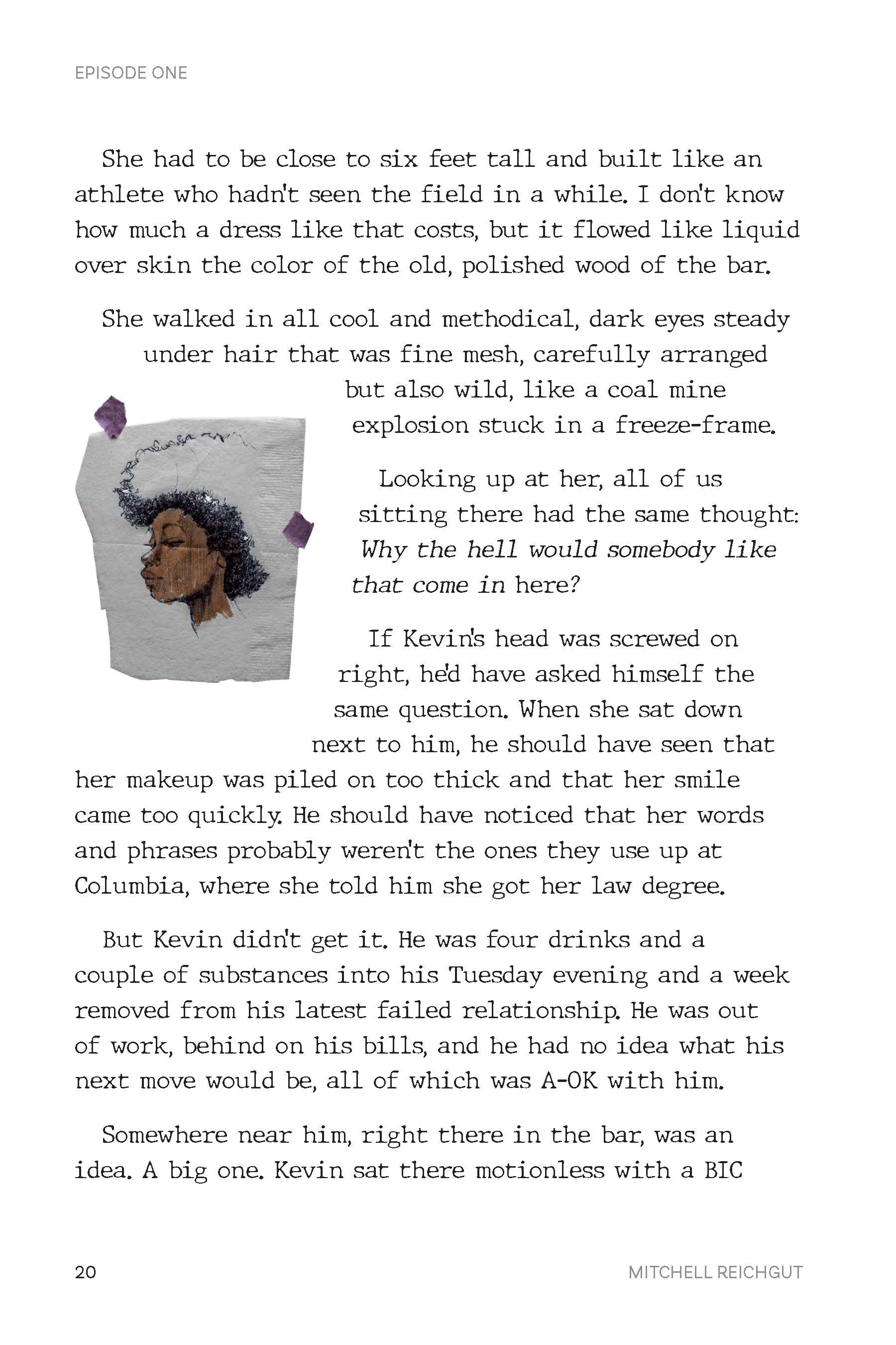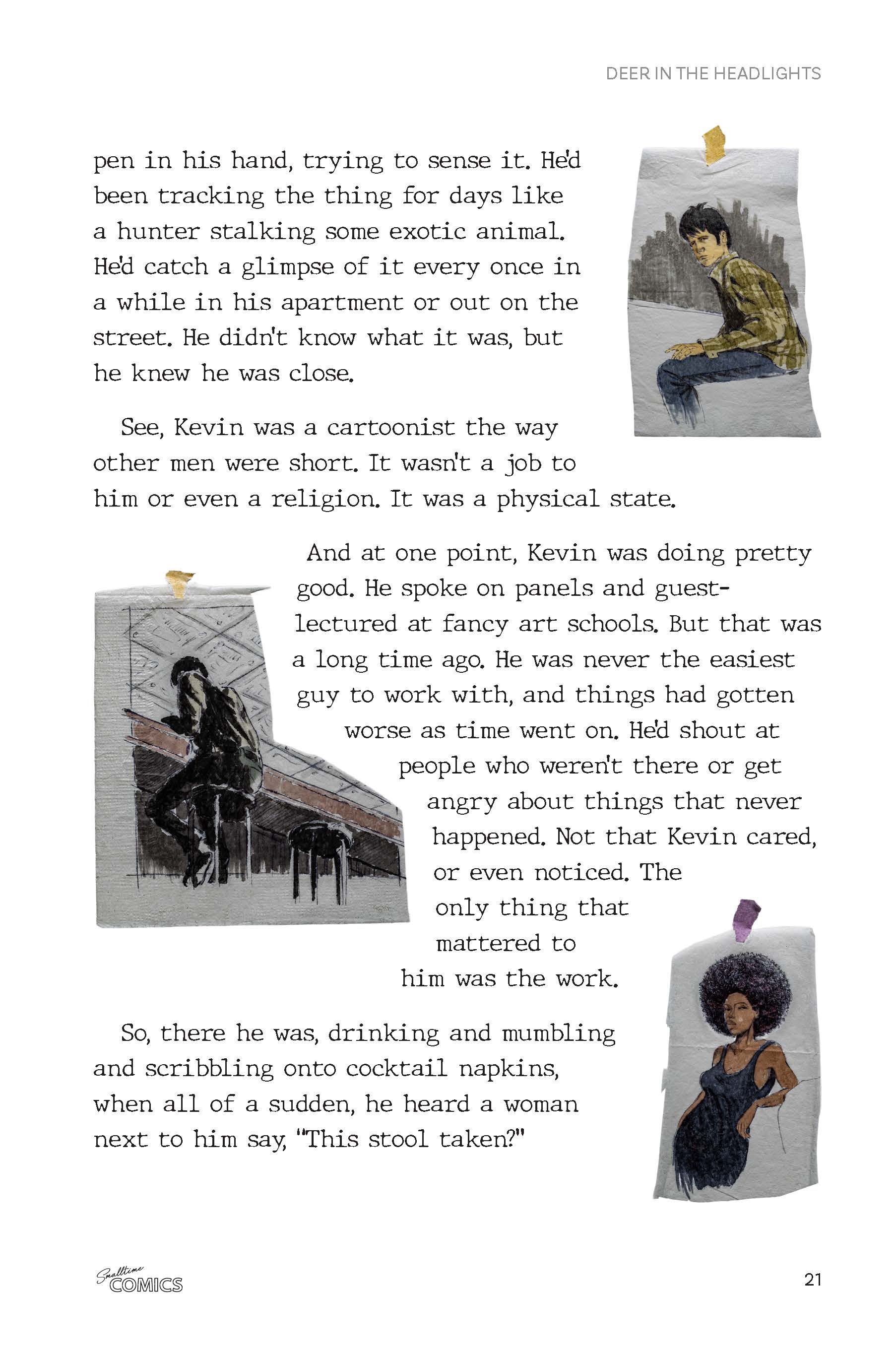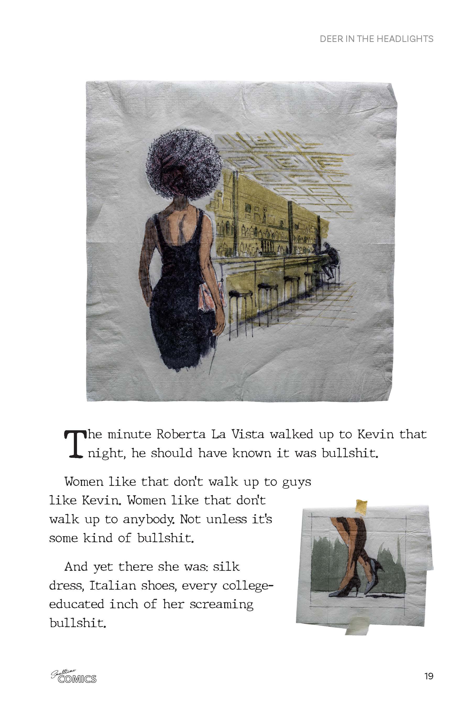 Smalltime Comics is a serialized noir crime novel with illustrations that were scrawled out on a stack of cocktail napkins, as if one of the characters sat in a bar and put it all on paper.