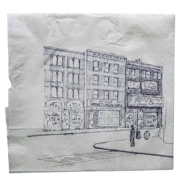 An original drawing from Episode One. BIC pen on a cocktail napkin. Signed, framed 7”x5”.